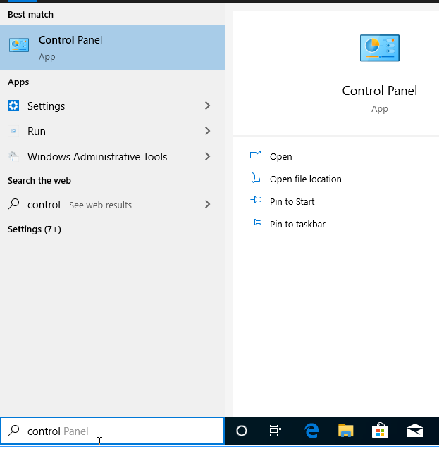 Do not run Outlook, instead search on the Start Menu or search bar for Control Panel. When found, select and run it: