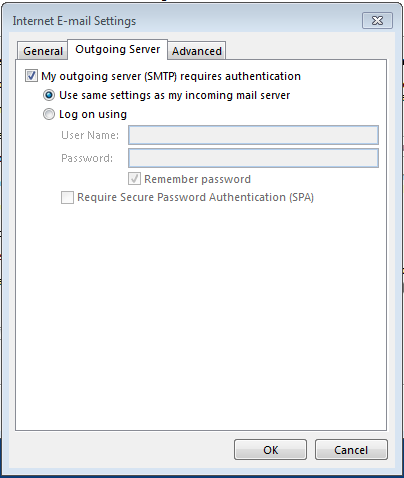 Select the Outgoing Server tab and tick the My outgoing server (SMTP) requires authentication box. Do NOT click OK.