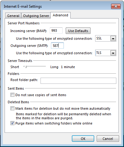 Pick TLS as the type of connection for Outgoing server(SMTP) and change number from 25 to 587. Click OK when finished.
