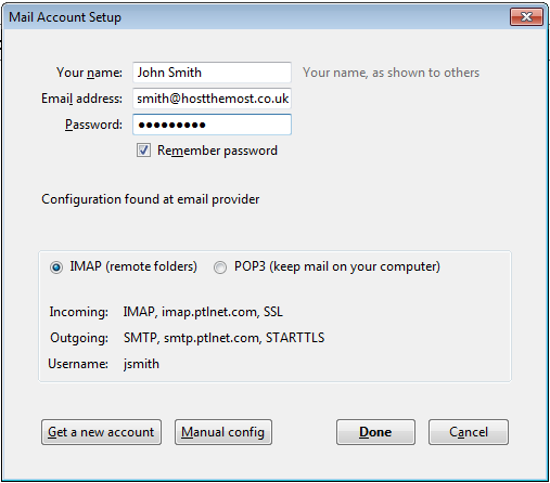 Assuming auto-configuration is configured on your domain (we will do this if we host DNS for your domain), Thunderbird will connect to our servers and automatically determine your email account settings (as long as you have typed your email address correctly). If auto-configuration is not configured, you will need to manually configure your account in Thunderbird. Click here to read more about configuring auto-configuration.