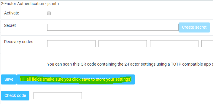 The 2-Factor Authentication page will be displayed. To quickly set up 2FA, you can click on the Fill all fields (make sure you click save to store your settings) button.