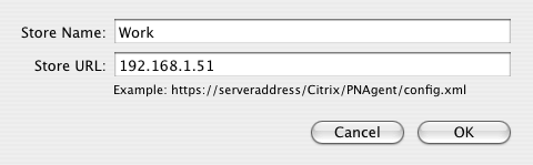 Enter a name (such as a Work or Network) in the Store Name field. In the Store URL box enter the name or IP address of your Citrix webinterface server (likely to be datastore if on your internal network). Click OK