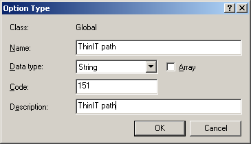 3) In "Predefined Options and Values" click on "Add..."4) In "Option Type" window, enter "ThinIT path" for Name, "String" for Data type (do not tick Array), "151" for Code and "ThinIT path" for Description