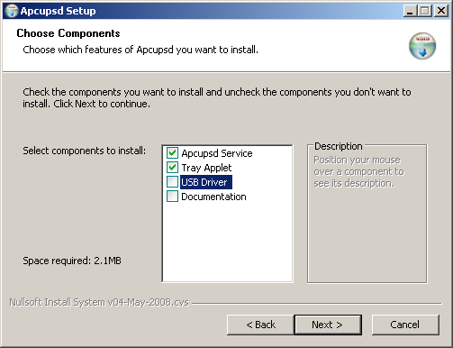 You can leave all options ticked on this window (as they are by default). Alternatively, you can unselect "USB Driver" (as you won't be connecting the UPS directly to this machine) and "Documentation" (as this walkthrough will be sufficient!). Click 'Next' when you have finished.