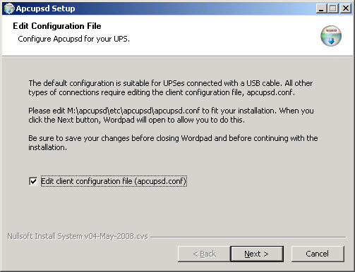 Ensure the box labelled 'Edit client configuration file (apcupsd.conf) is ticked and click next: