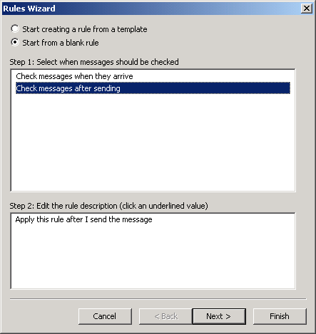 Select "Start from a blank rule" in the top section and then select "Check messages after sending" in the Step 1 box. Click on "Next >".