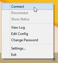 Once you have saved your configuration file, click on the OpenVPN GUI icon in the system tray. You will notice that more options are now available, including Connect. To connect to the VPN simply choose the Connect option (you must ensure that you have a live Internet connection already).