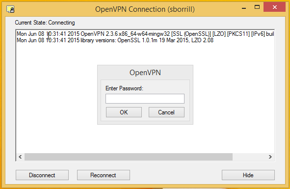 When connecting you may be prompted for your passphrase (shown below as "Enter Password") or your username and password (if using username/password authentication).