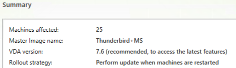 - After updating the image, you must restart the VMs using Studio for the changes to take effect. Therefore you must specify when to update/restart the VMs. If machines are in use, users can be warned up to 15 minutes in advance and the restarts can be staggered up to 5 hours apart. Unfortunately, you cannot specify a delay before the restarts begin to happen. Therefore, if the machines are in active use, picking On next shutdown (not right now) is probably best. However you must remember to reboot the machines from within Studio, using XenCenter is NOT good enough. Click Next: